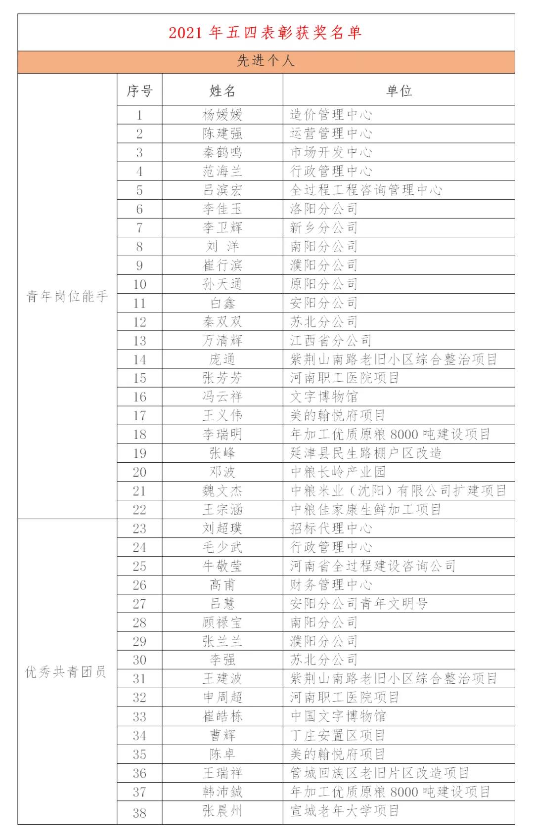 根據(jù)評(píng)選表彰辦法,在對(duì)候選對(duì)象進(jìn)行初評(píng)、考察、復(fù)核的基礎(chǔ)上,經(jīng)評(píng)委會(huì)審議,現(xiàn)對(duì)擬表彰個(gè)人(集體)進(jìn)行公示。決定授予楊媛媛、崔行濱等22人為“青年崗位能手”、授予李勁、張尚新等20人為“匠心服務(wù)標(biāo)兵”,授予申周超、呂慧等22人為“優(yōu)秀共青團(tuán)員”,授予嚴(yán)巍、平治中等5人為“青年創(chuàng)業(yè)標(biāo)兵”;授予新鄉(xiāng)分公司、南陽(yáng)分公司等為“創(chuàng)新創(chuàng)業(yè)先進(jìn)集體”,授予濟(jì)源分公司、原陽(yáng)分公司等為“志愿服務(wù)先進(jìn)集體”,授予濮陽(yáng)分公司、洛陽(yáng)分公司等為“青年文明號(hào)”(詳細(xì)名單見(jiàn)附件)。