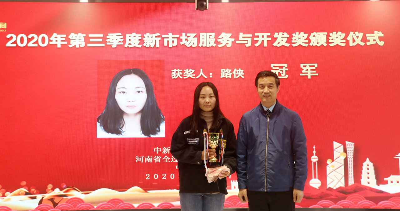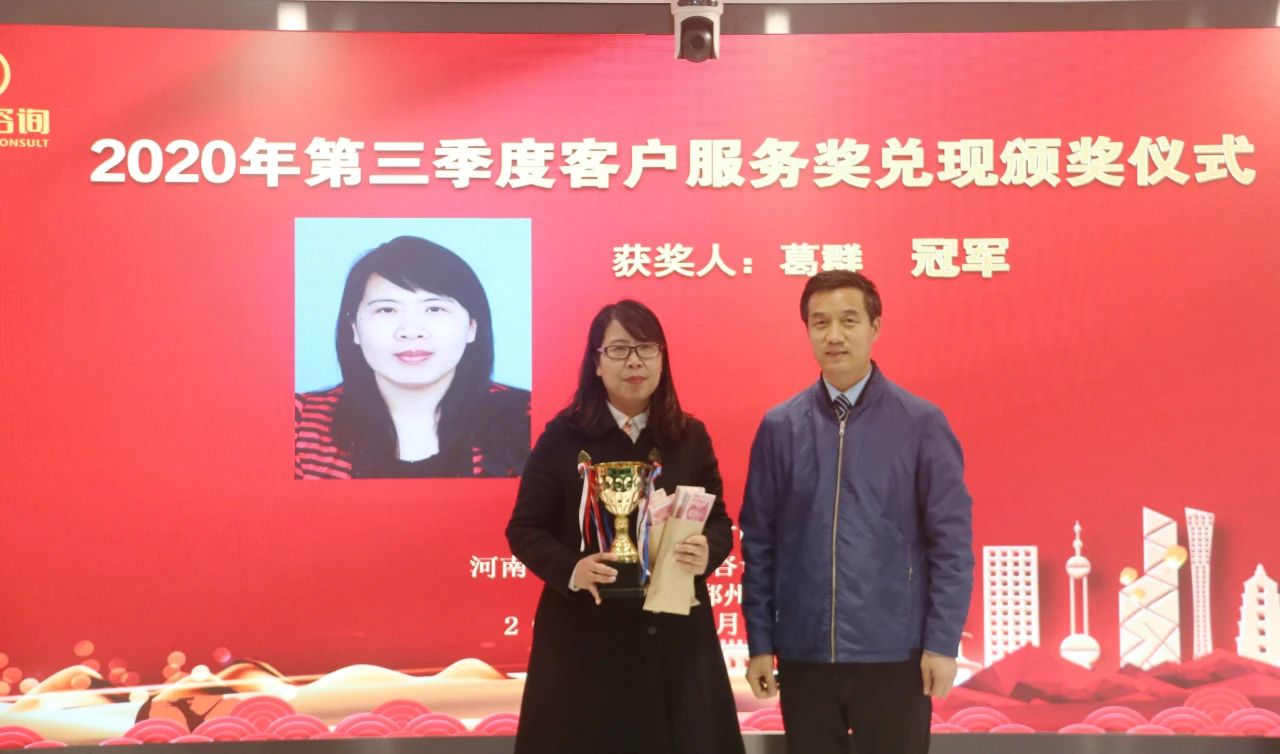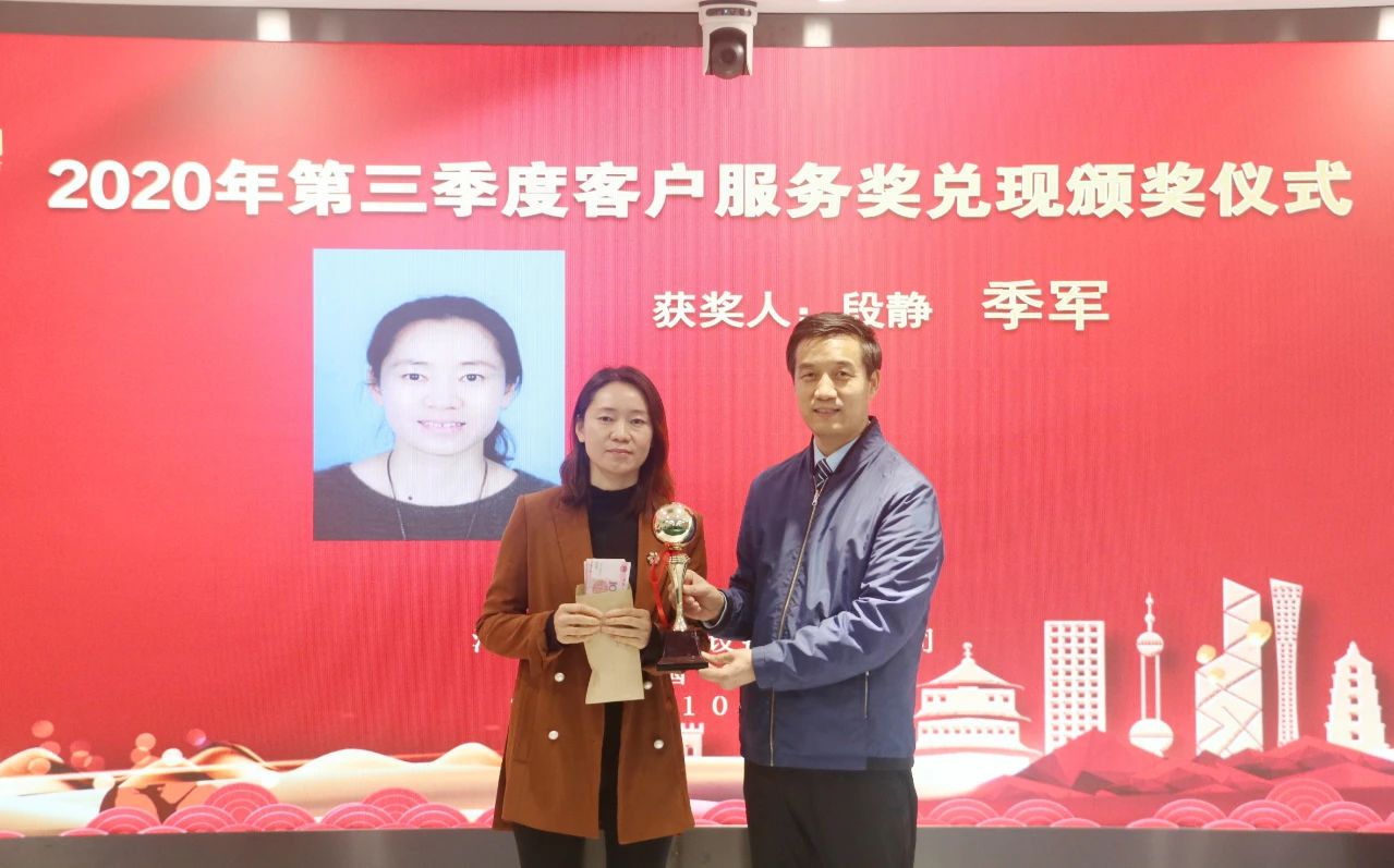 董事長楊明宇為在2020年第三季度客戶服務(wù)工作中表現(xiàn)突出的先進(jìn)個(gè)人頒發(fā)獎(jiǎng)杯和獎(jiǎng)金。
